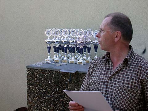 Gerhard, a vezérfarkas (mert hogy valami farkasos nevű egyesület a helyi FT-klub) a kupákkal.